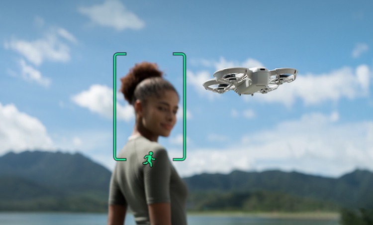 The drone supports palm takeoff/landing, QuickShots, AI subject tracking, automated flight paths, and obstacle avoidance for smooth and cinematic footage.